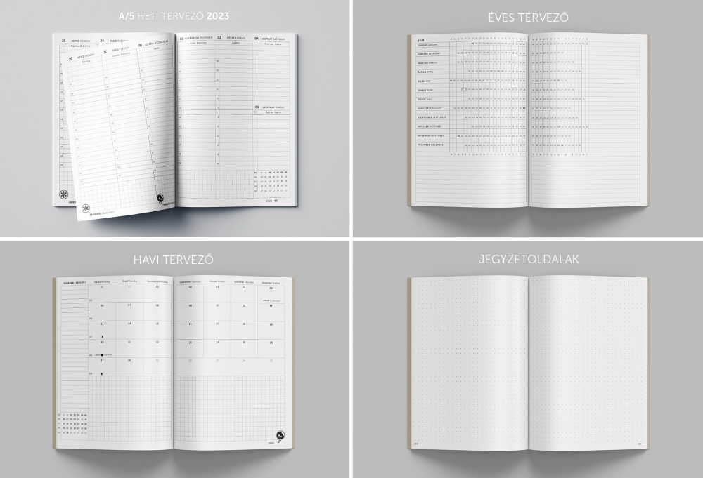 - A határidőnapló elején éves és havi tervezők