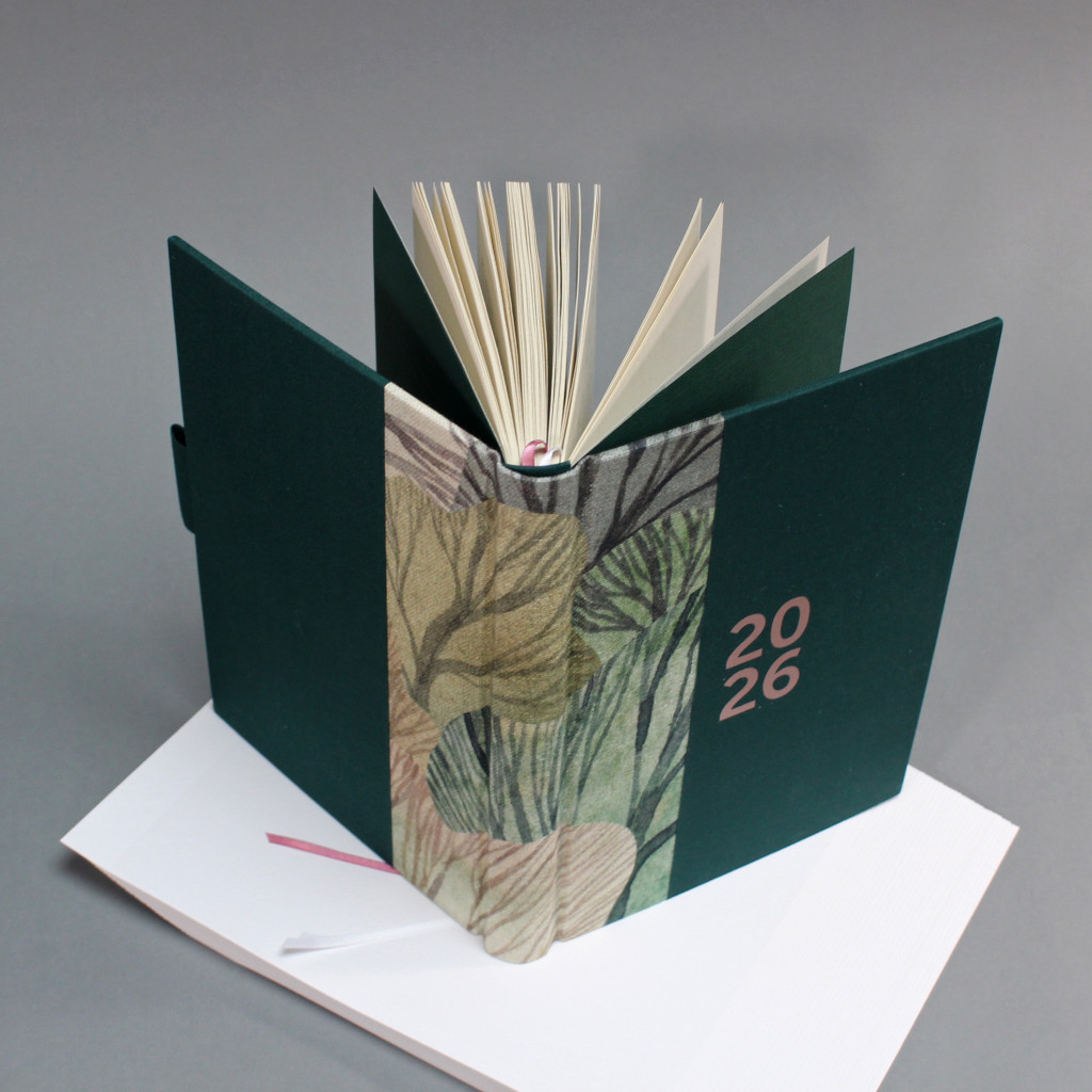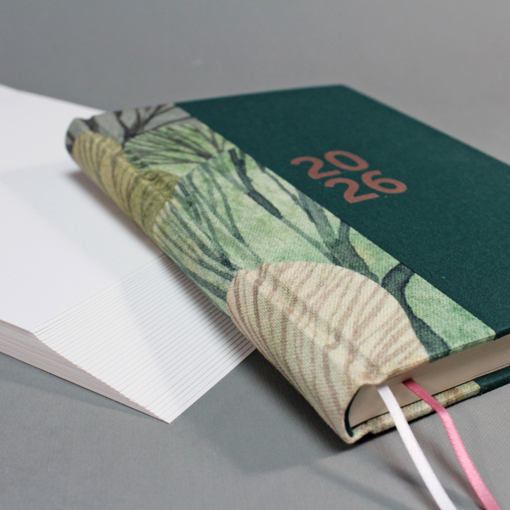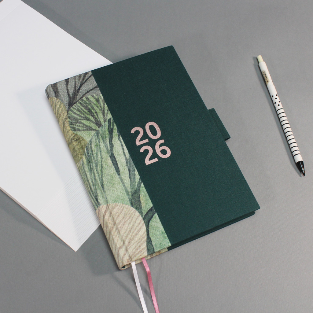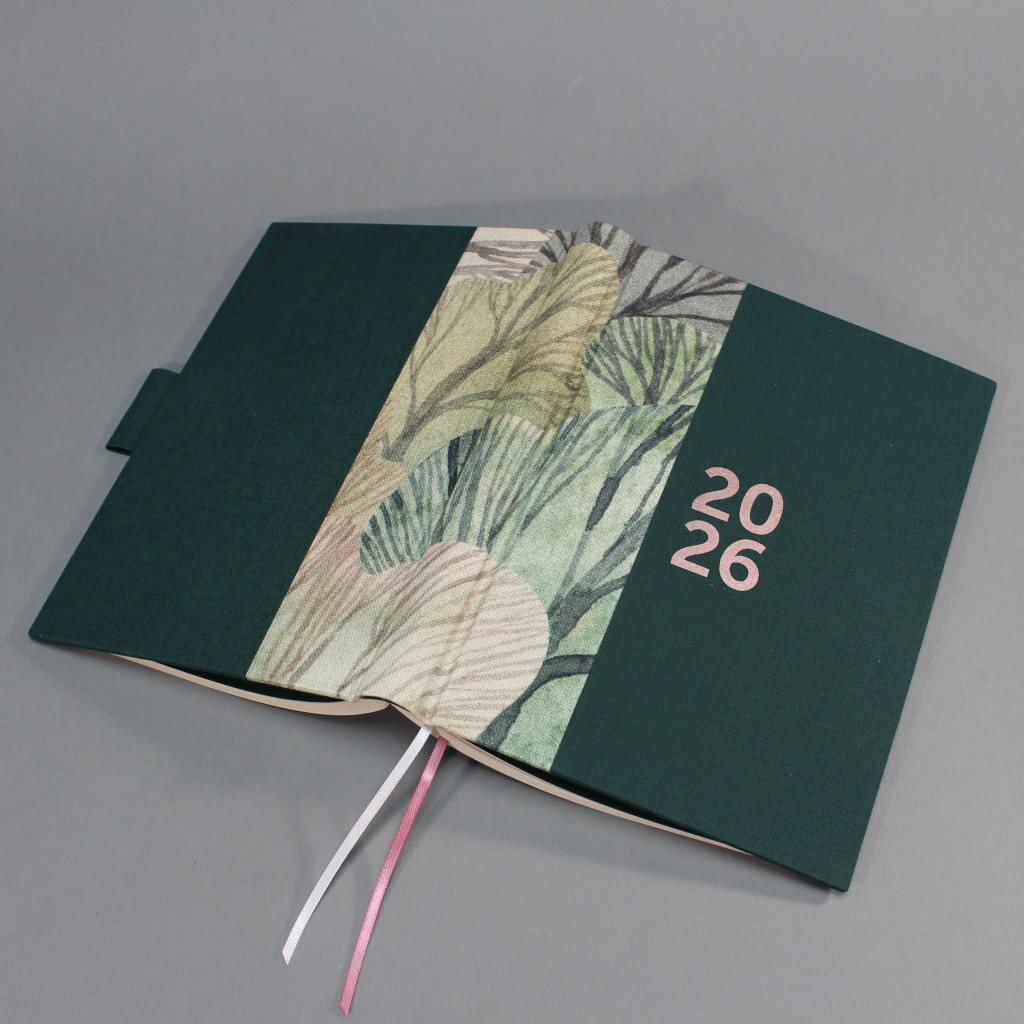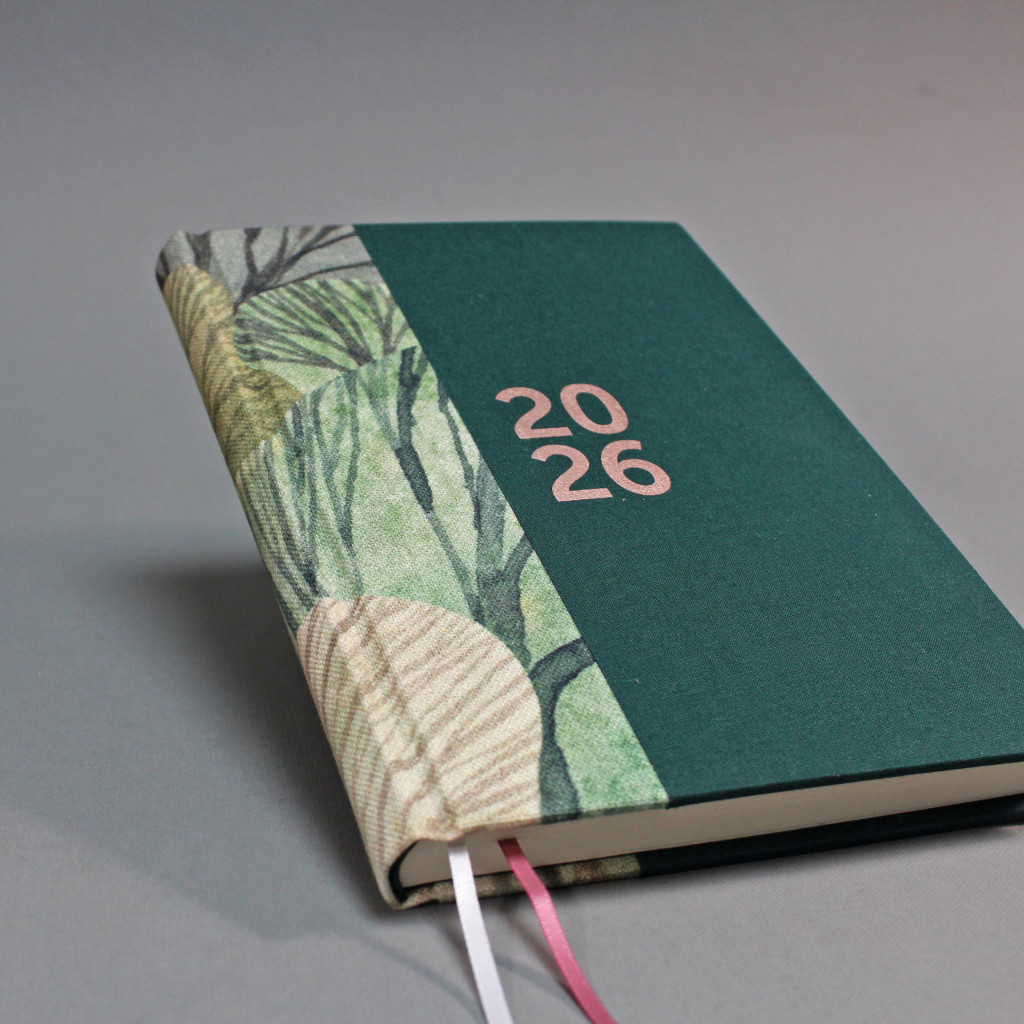 2026 heti tervező - zöld és famintás vászon, matt rozé arany felirat