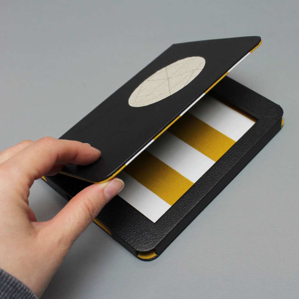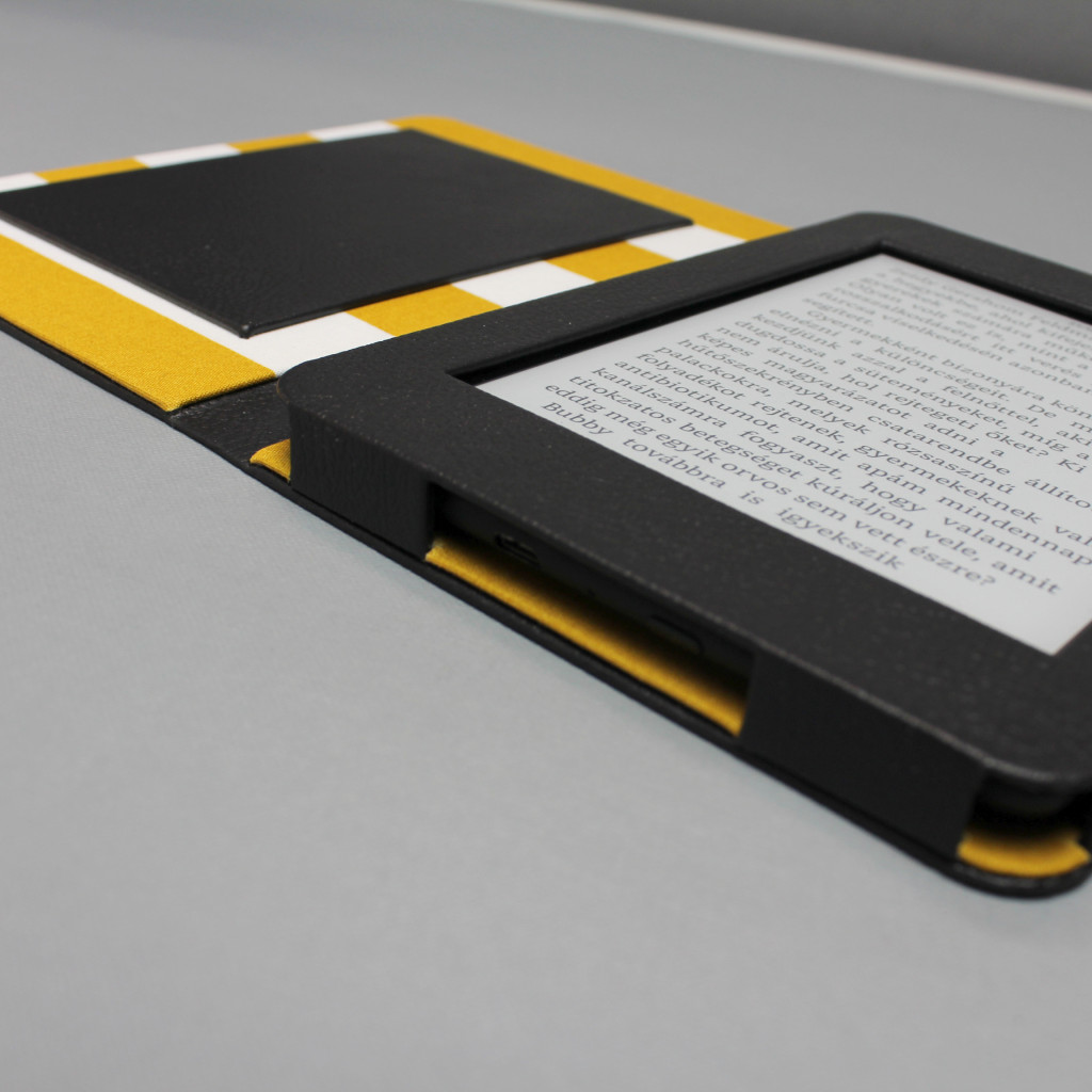 E-könyv olvasóhoz készült műbőr és vászon borítású, mágnessel záródó tok.