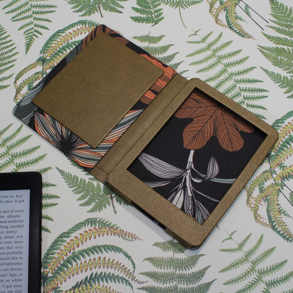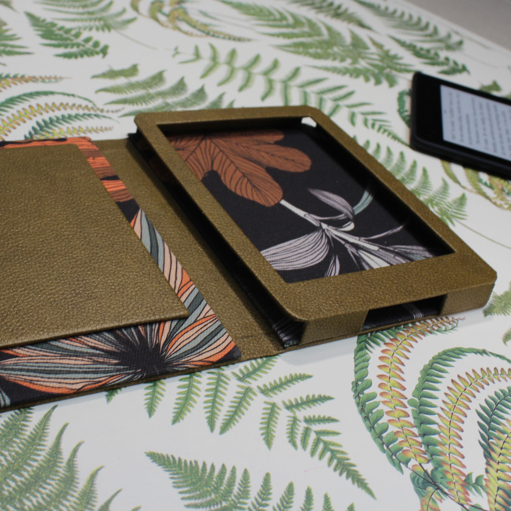 E-könyv olvasóhoz készült műbőr és vászon borítású, mágnessel záródó tok.
