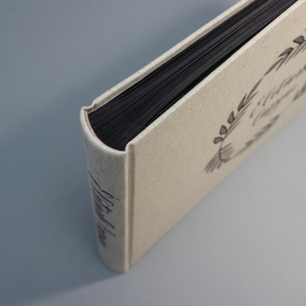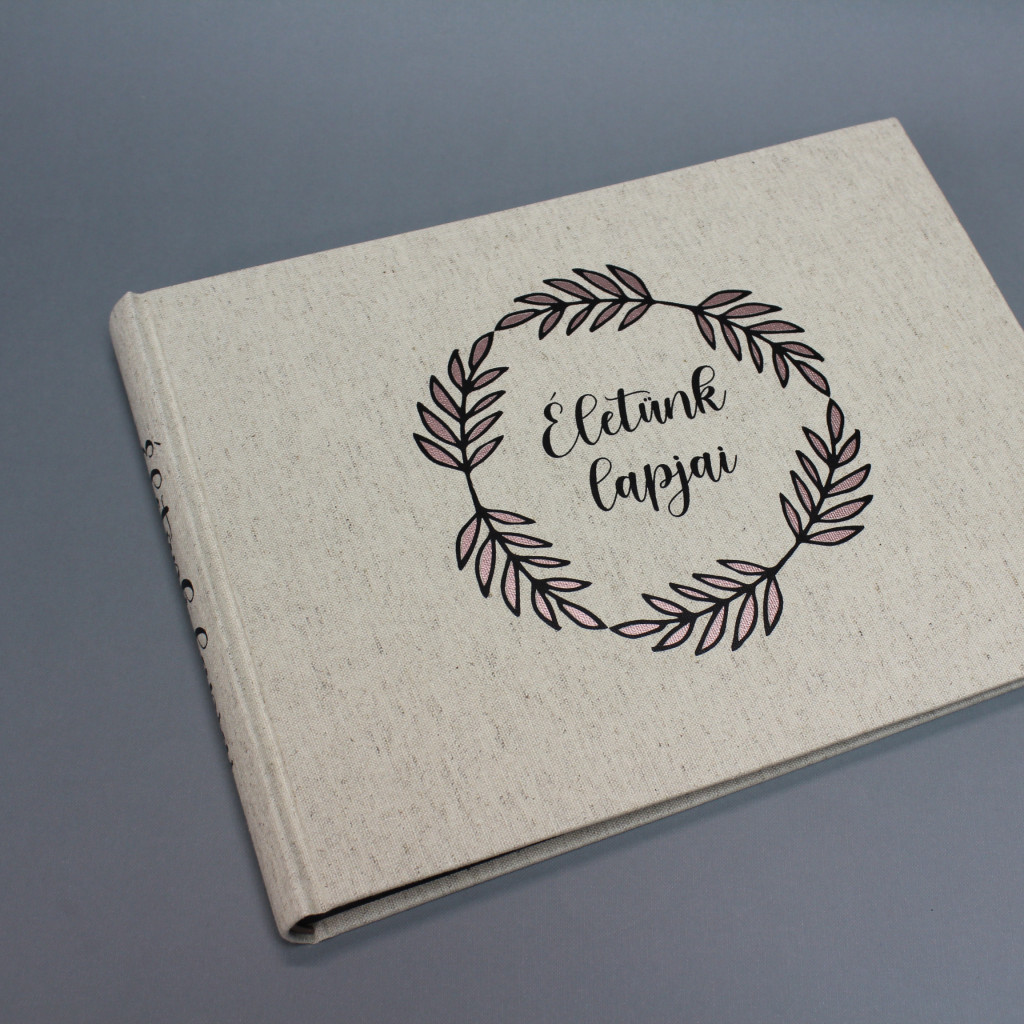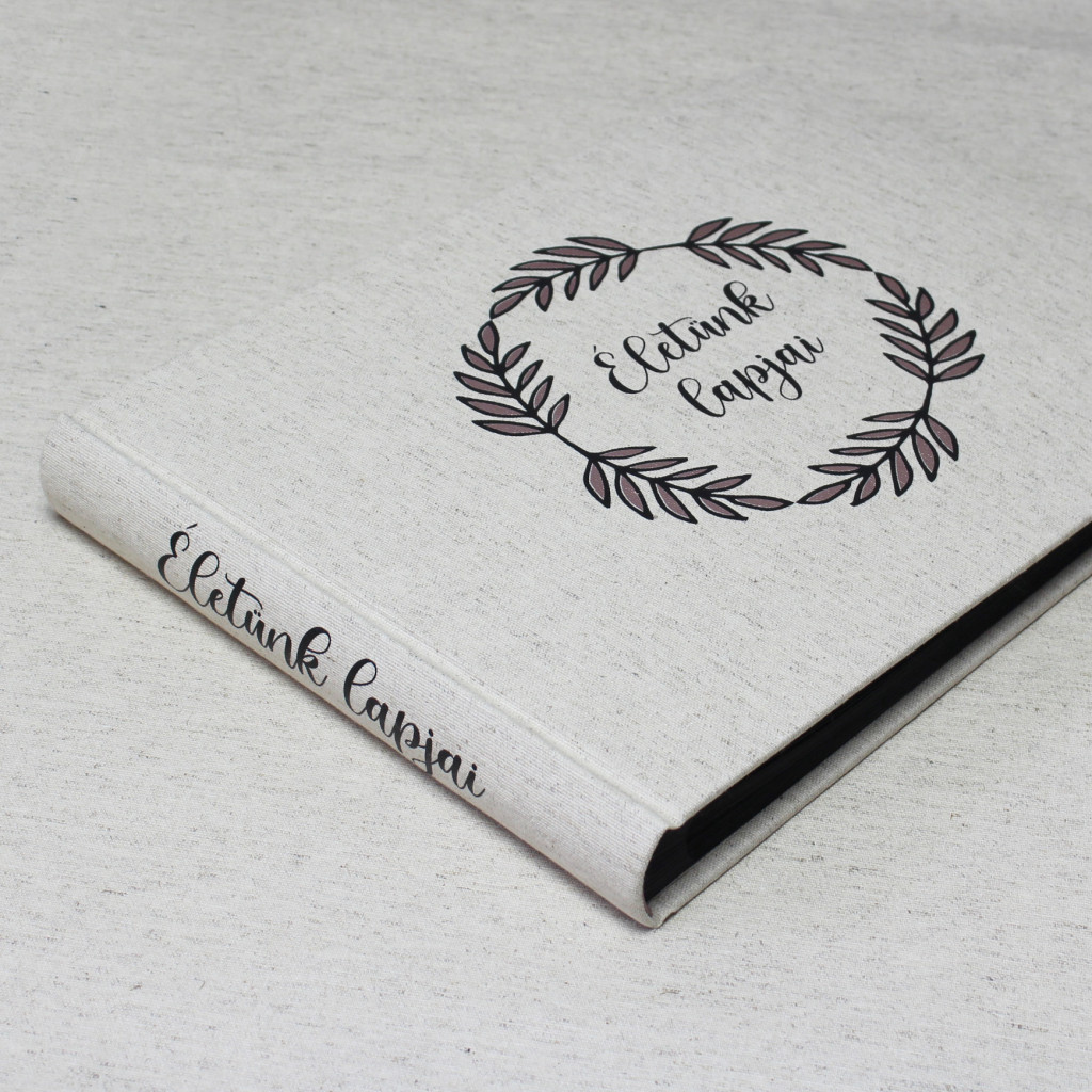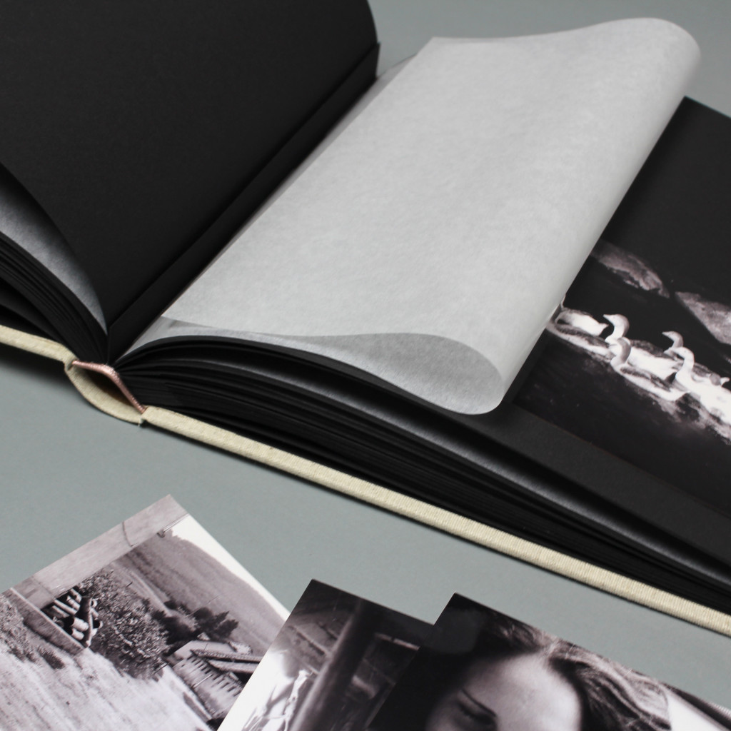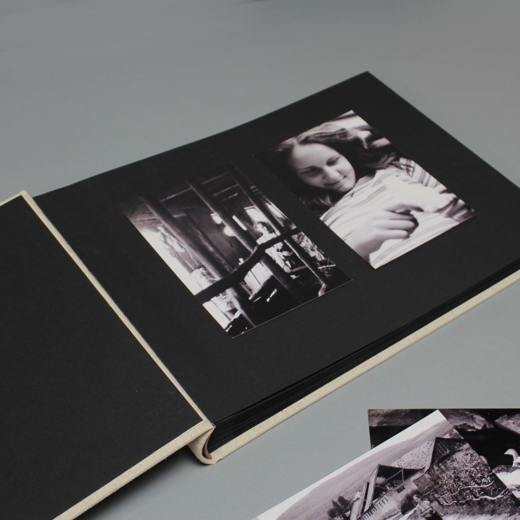 - lapok: kézzel fűzött, natúrbarna fotókarton, a lapok között átlátszó, pergamen lapok védik a fényképeket